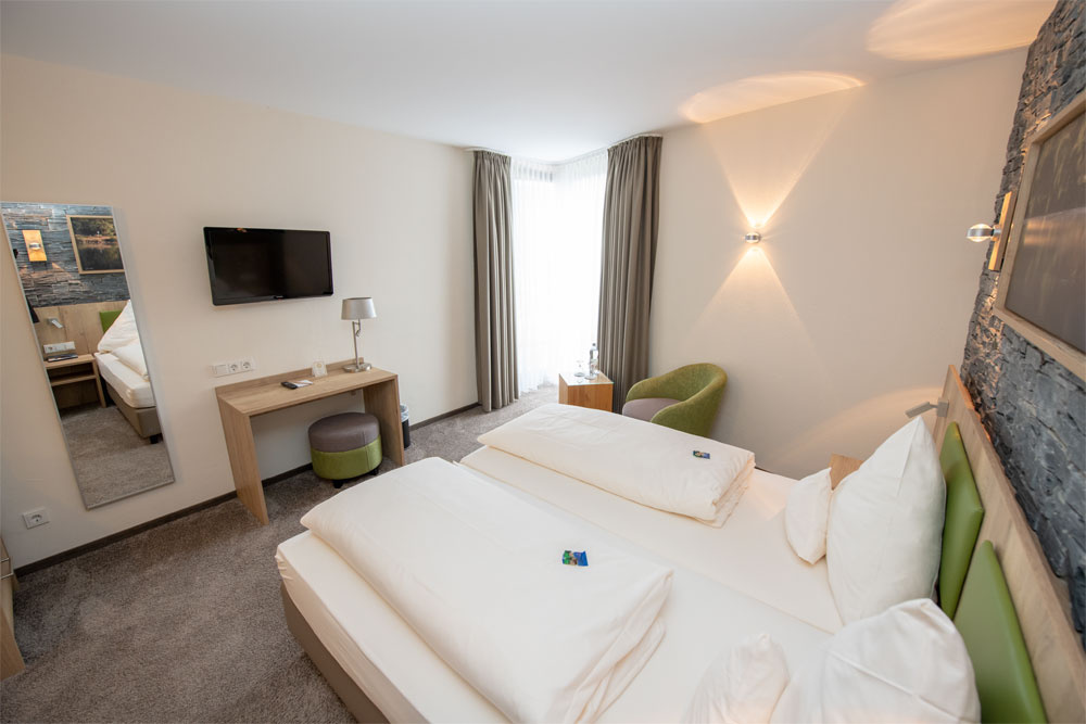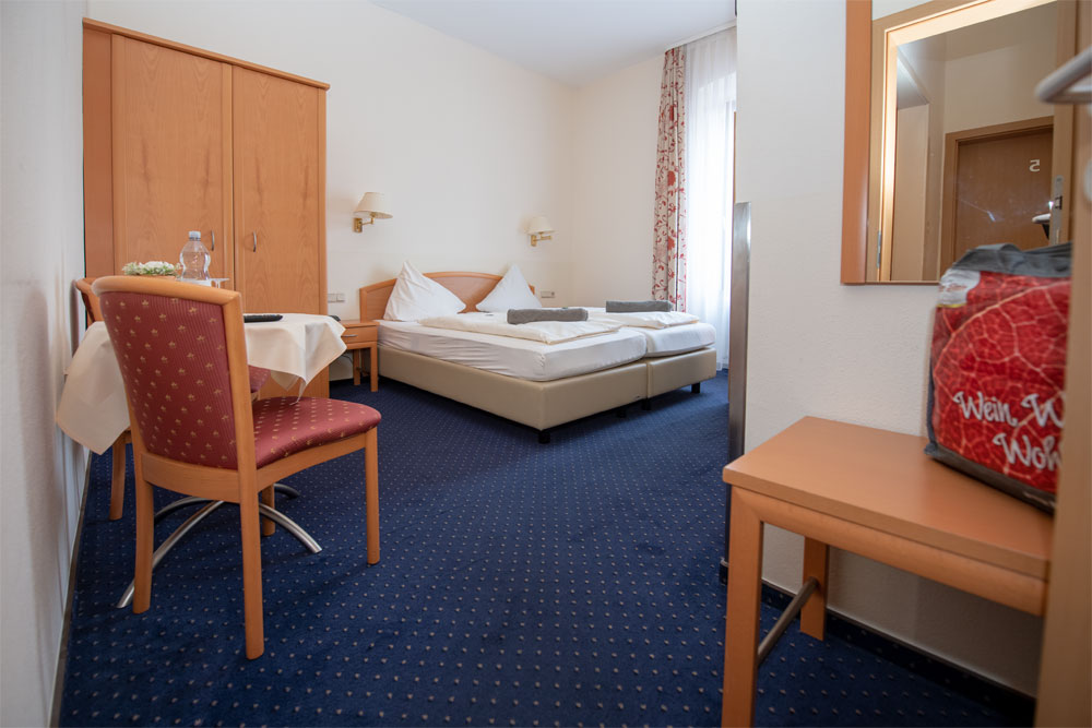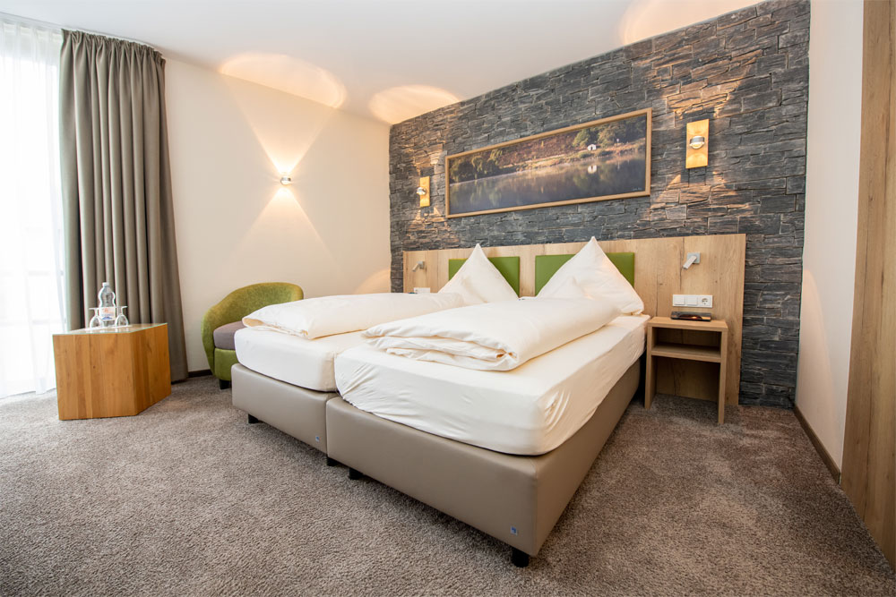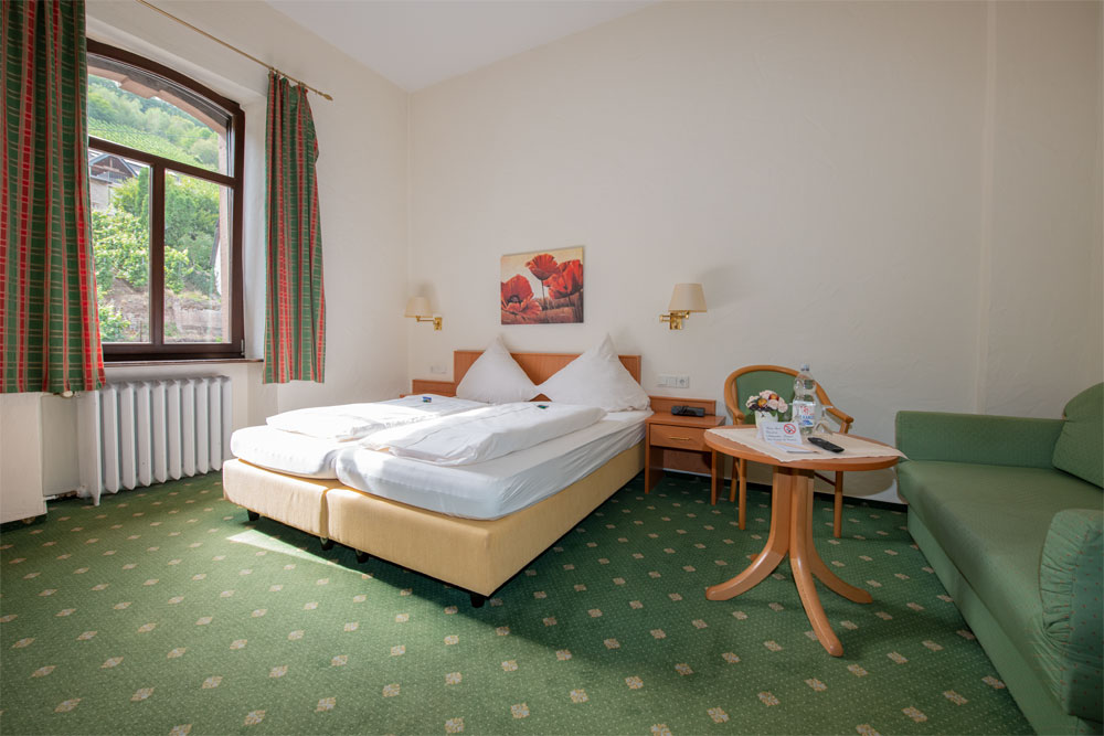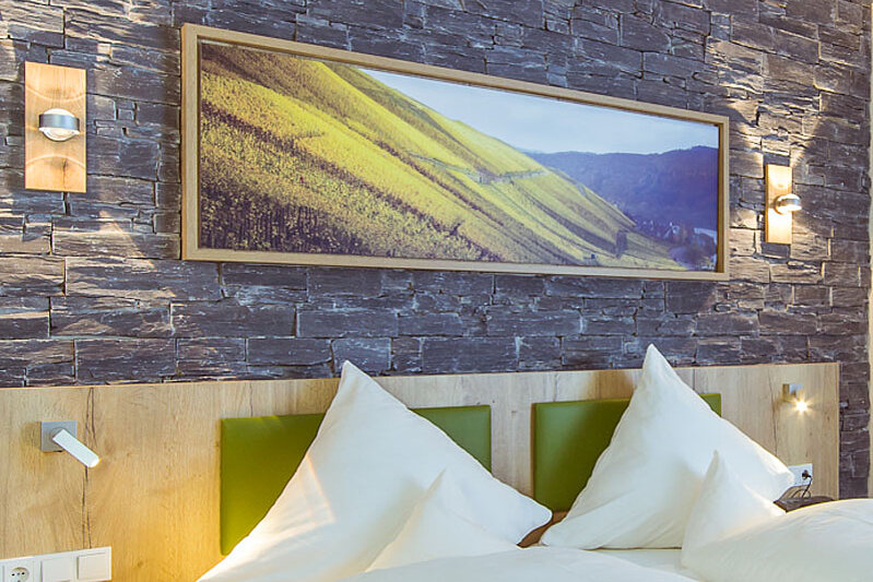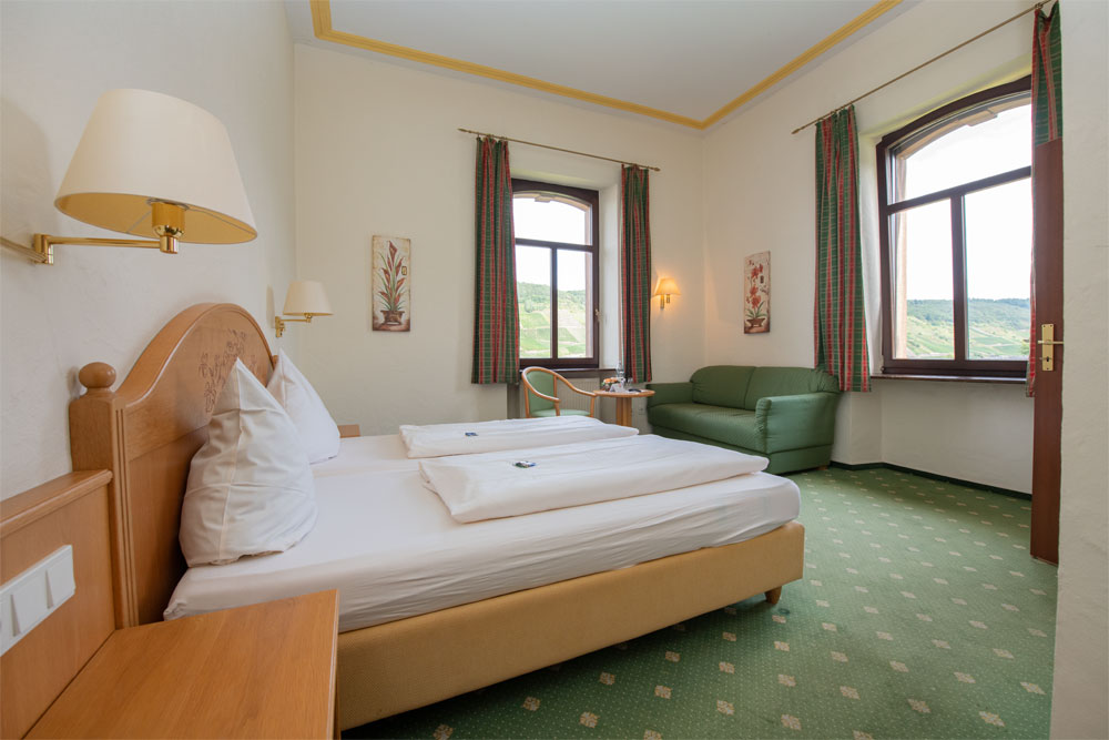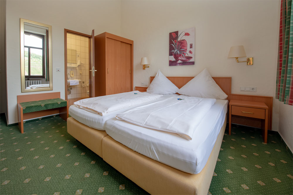 Doppelzimmer ca. 25 qm im Stammhaus Nalbach und Gästehaus Mosella. In unserem barrierefreien Gästehaus mit modern renovierten, moselländischen Zimmern haben Sie freien Blick auf die Weinberge.